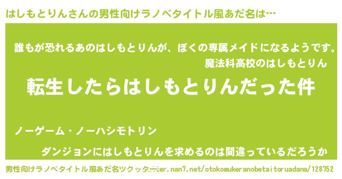 | 女子向けラノベタイトル風あだ名 | 『はしもとりんの玉の輿計画!』 |