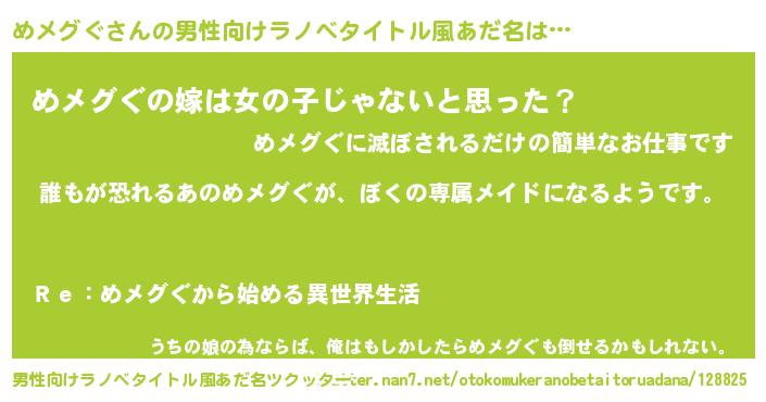 | 女子向けラノベタイトル風あだ名 | 『異世界でカフェめメグぐを開店しました。』 |