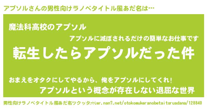 | 女子向けラノベタイトル風あだ名 | 『アプソルの玉の輿計画!』 |