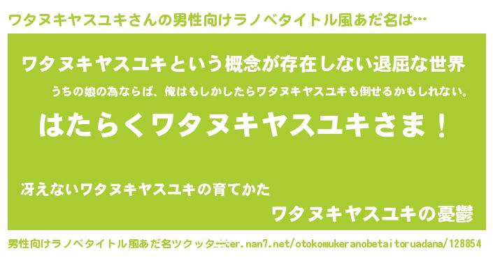 | 胡散臭い通販商品みたいなあだ名 | 『絶対に幸福をもたらす水素水…その名も「ワタヌキヤスユキ」』 |