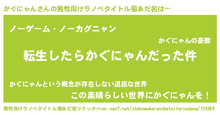 | 女子向けラノベタイトル風あだ名 | 『かぐにゃんの玉の輿計画!』 |
