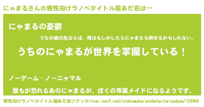 | 女子向けラノベタイトル風あだ名 | 『男装にゃまるの憂鬱な任務』 |