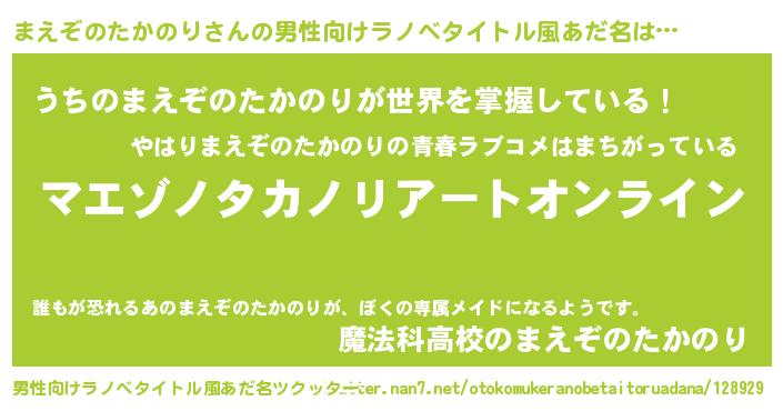 | 女子向けラノベタイトル風あだ名 | 『まえぞのたかのり姫と円卓の騎士』 |