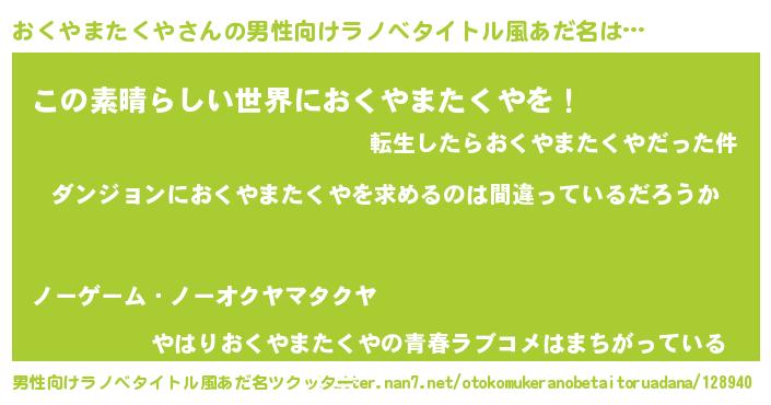 | 女子向けラノベタイトル風あだ名 | 『おくやまたくやの卵を拾いまして』 |