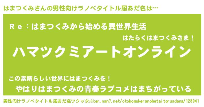 | 女子向けラノベタイトル風あだ名 | 『誰かこのはまつくみを説明してください! ~契約から始まるウェディング~』 |
