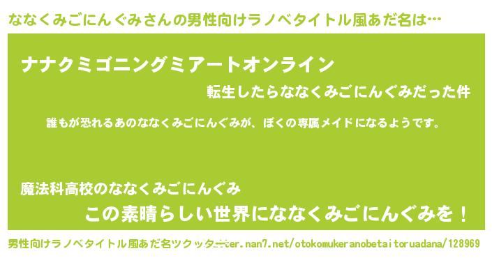 | 女子向けラノベタイトル風あだ名 | 『異世界でカフェななくみごにんぐみを開店しました。』 |
