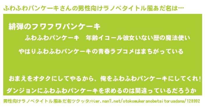| 女子向けラノベタイトル風あだ名 | 『ふわふわパンケーキの雑貨屋さん』 |