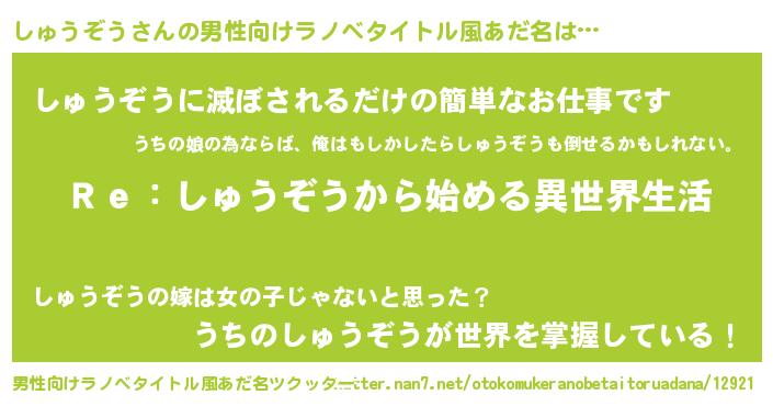 | 女子向けラノベタイトル風あだ名 | 『闇のしゅうぞう』『しゅうぞうの婚約者』 |