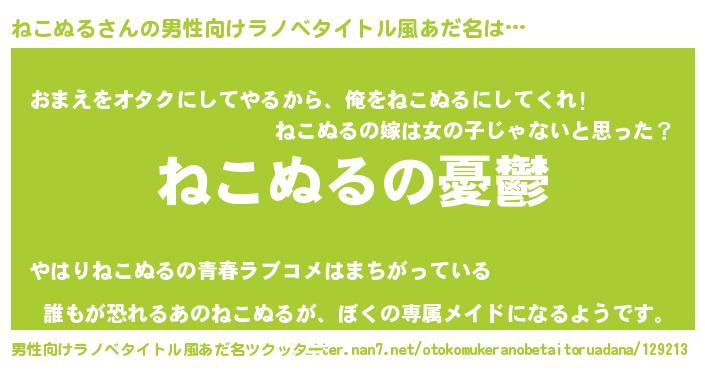 | 女子向けラノベタイトル風あだ名 | 『(仮)ねこぬるのやんごとなき事情』 |