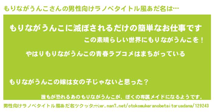 | 女子向けラノベタイトル風あだ名 | 『もりながうんこの雑貨屋さん』 |