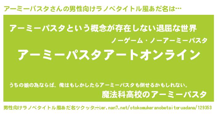 | ヘコむあだ名 | 『アーにゅー』『アーミーパスタ(震え声)』 |