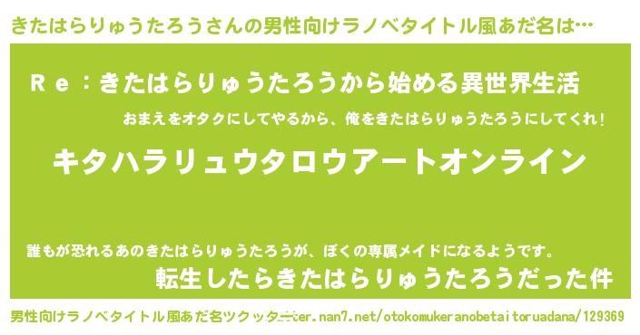 | 女子向けラノベタイトル風あだ名 | 『誰かこのきたはらりゅうたろうを説明してください! ~契約から始まるウェディング~』 |