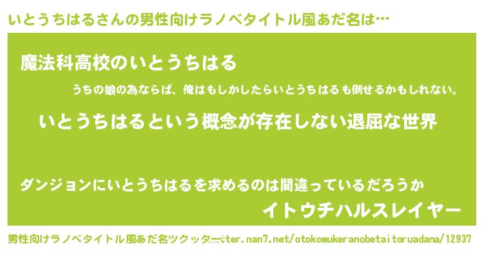 | 胡散臭い通販商品みたいなあだ名 | 『来世でも幸せになれる水素水…その名も「いとうちはる」』 |