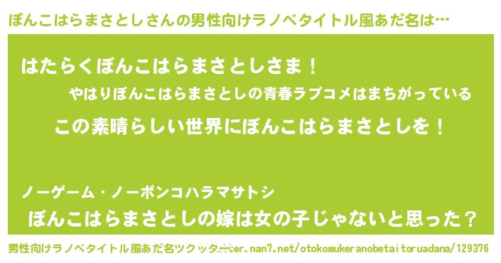 | 女子向けラノベタイトル風あだ名 | 『悪役ぼんこはらまさとしに転生したようですが、知った事ではありません』 |