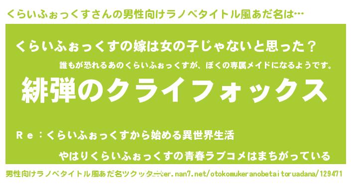 | 胡散臭い通販商品みたいなあだ名 | 『信頼と実績のサプリメント…その名も「くらいふぉっくす」』 |