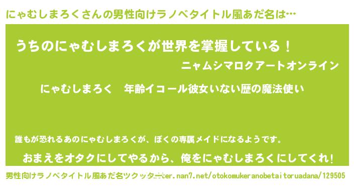 | 女子向けラノベタイトル風あだ名 | 『にゃむしまろくの玉の輿計画!』 |
