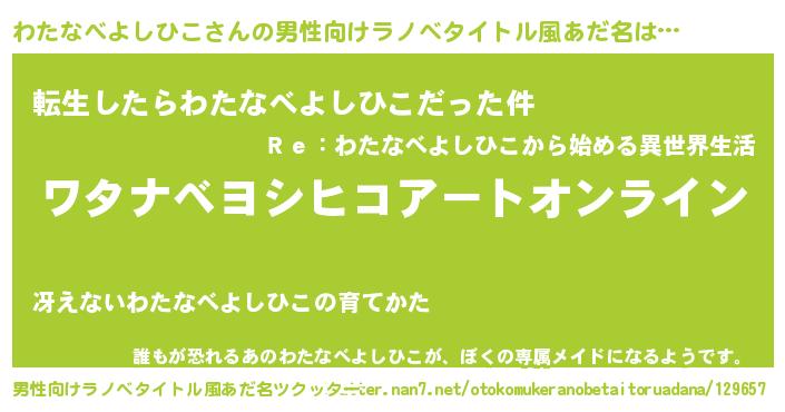 | 女子向けラノベタイトル風あだ名 | 『誰かこのわたなべよしひこを説明してください! ~契約から始まるウェディング~』 |