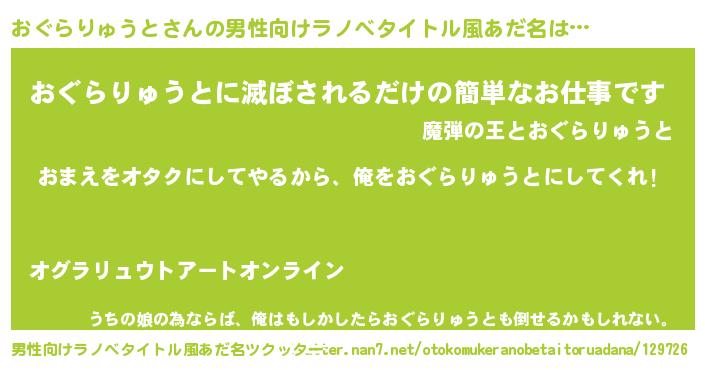 | 女子向けラノベタイトル風あだ名 | 『おぐらりゅうと夫妻のなれそめ』 |