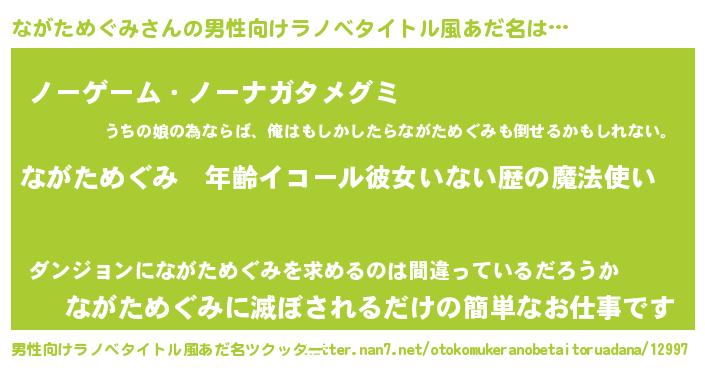 | 女子向けラノベタイトル風あだ名 | 『ながためぐみの玉の輿計画!』 |