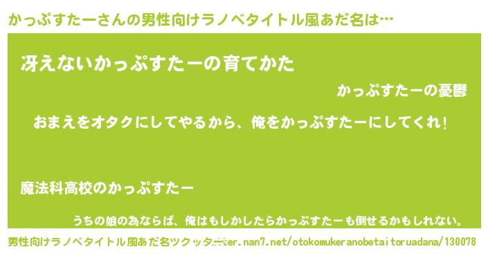 | 女子向けラノベタイトル風あだ名 | 『かっぷすたー夫妻のなれそめ』 |
