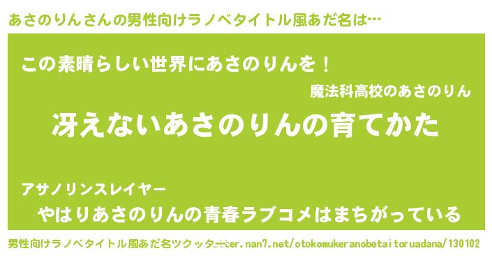 | 女子向けラノベタイトル風あだ名 | 『シンデレラあさのりん家の靴箱館』 |