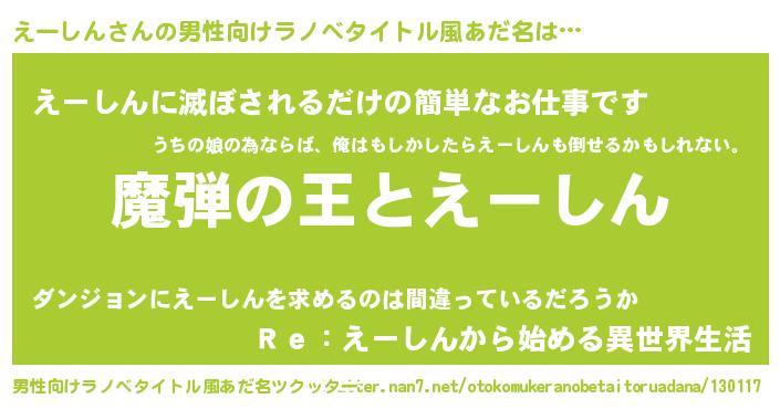 | 女子向けラノベタイトル風あだ名 | 『えーしんが死なない童話 林檎のえーしんの診療簿』 |