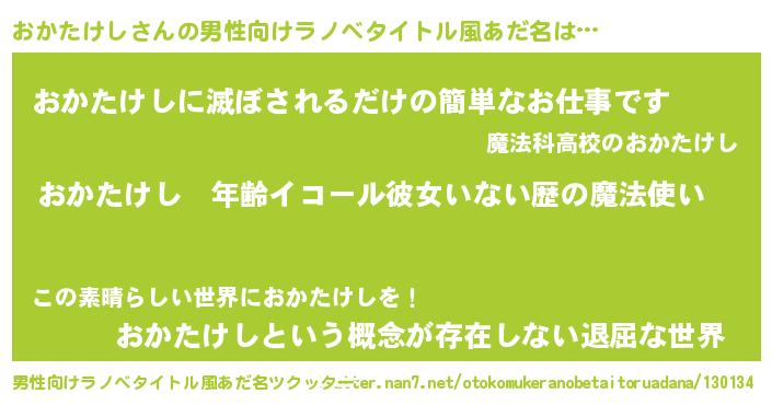 | 女子向けラノベタイトル風あだ名 | 『おかたけしの玉の輿計画!』 |