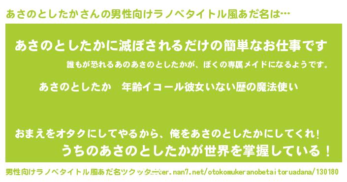 | 女子向けラノベタイトル風あだ名 | 『あさのとしたかの玉の輿計画!』 |