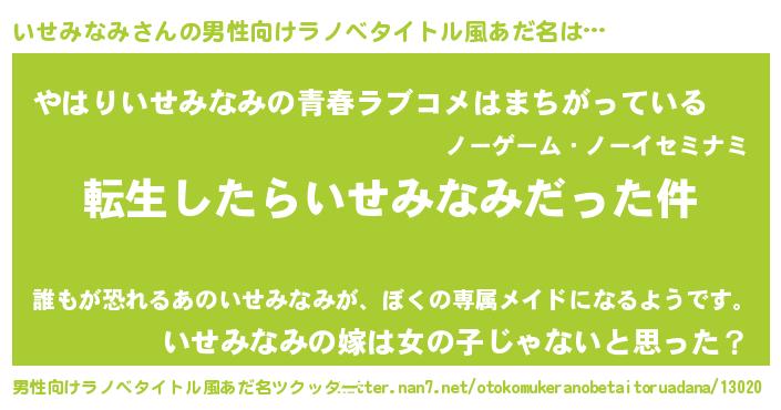 | 女子向けラノベタイトル風あだ名 | 『いせみなみの玉の輿計画!』 |