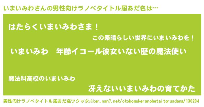 | 胡散臭い通販商品みたいなあだ名 | 『あなたにだけ特別に提供する100年もののヴィンテージワイン…その名も「いまいみわ」』 |