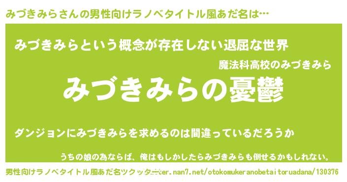 | 女子向けラノベタイトル風あだ名 | 『(仮)みづきみらのやんごとなき事情』 |
