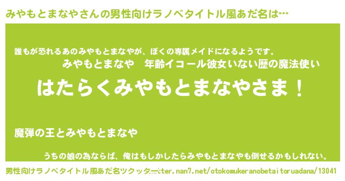 | 胡散臭い通販商品みたいなあだ名 | 『絶対に幸福をもたらす健康食品…その名も「みやもとまなや」』 |