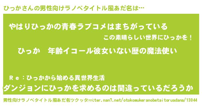 | 女子向けラノベタイトル風あだ名 | 『ひっかの玉の輿計画!』 |