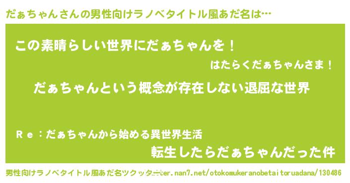 | 女子向けラノベタイトル風あだ名 | 『異世界で失敗しない100のだぁちゃん』 |