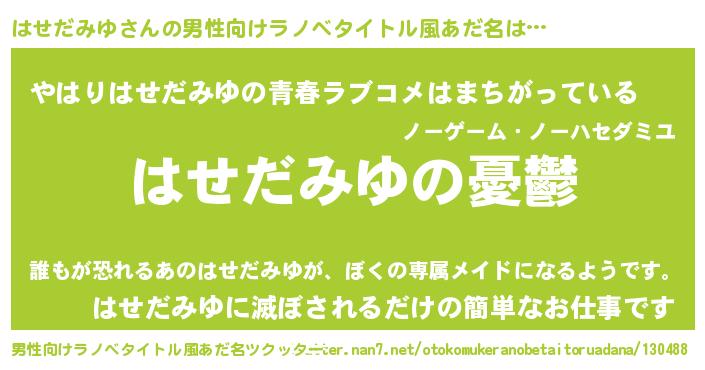 | 女子向けラノベタイトル風あだ名 | 『(仮)はせだみゆのやんごとなき事情』 |