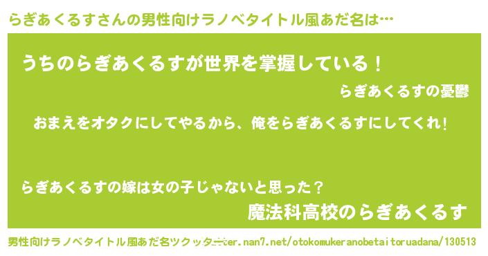 | 女子向けラノベタイトル風あだ名 | 『らぎあくるす夫妻のなれそめ』 |