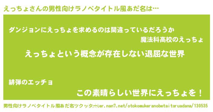 | 女子向けラノベタイトル風あだ名 | 『異世界で失敗しない100のえっちょ』 |