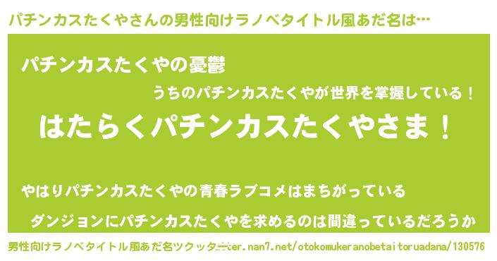 | 胡散臭い通販商品みたいなあだ名 | 『必ず成功するブレスレット…その名も「パチンカスたくや」』 |