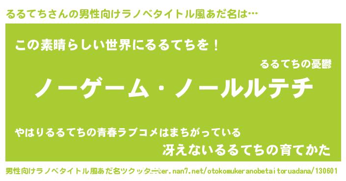 | 女子向けラノベタイトル風あだ名 | 『死神るるてちの再婚』 |