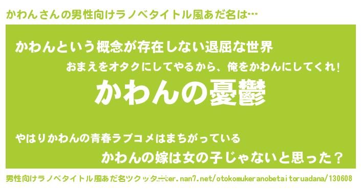 | 女子向けラノベタイトル風あだ名 | 『(仮)かわんのやんごとなき事情』 |