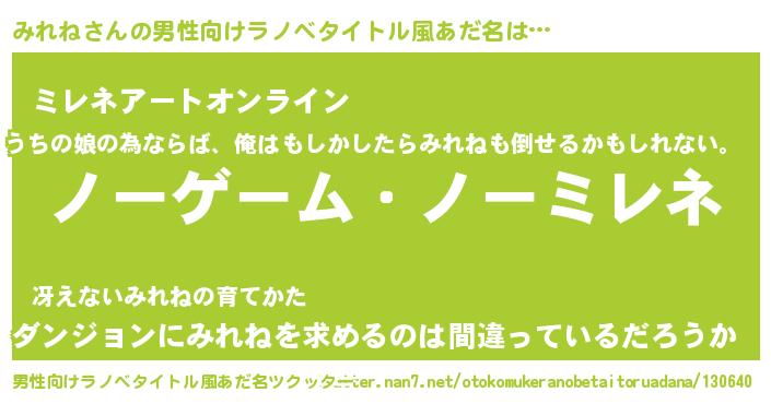 | 女子向けラノベタイトル風あだ名 | 『死神みれねの再婚』『みれねの婚約者』 |