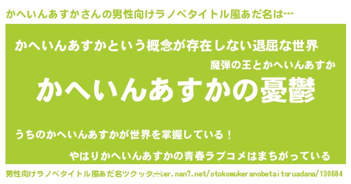 | 女子向けラノベタイトル風あだ名 | 『かへいんあすか姫と円卓の騎士』 |