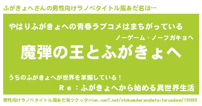 | 女子向けラノベタイトル風あだ名 | 『乙女ゲームの破滅フラグしかない悪役ふがきょへに転生してしまった…』 |