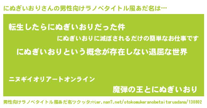 | 女子向けラノベタイトル風あだ名 | 『異世界で失敗しない100のにぬぎいおり』 |