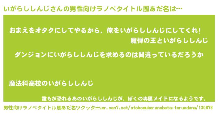 | 胡散臭い通販商品みたいなあだ名 | 『信頼と実績のサプリメント…その名も「いがらししんじ」』 |