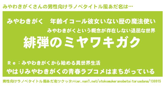 | 女子向けラノベタイトル風あだ名 | 『シンデレラみやわきがく家の靴箱館』 |
