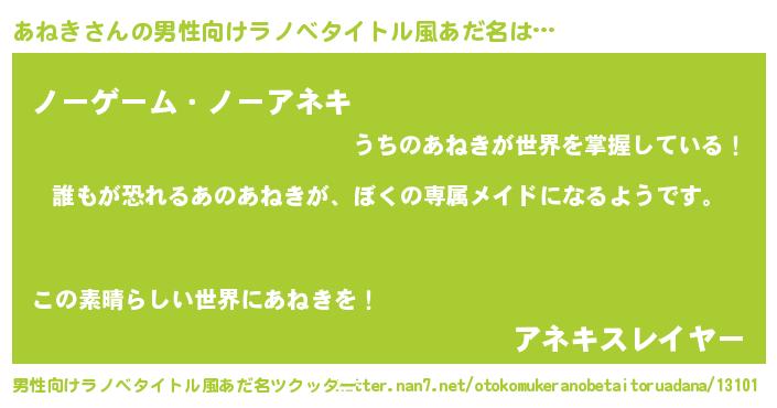 | 女子向けラノベタイトル風あだ名 | 『あねきの契約王妃』『死神あねきの再婚』 |