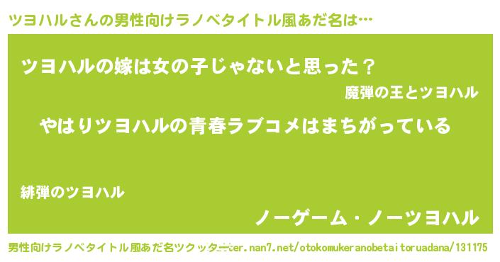 | 女子向けラノベタイトル風あだ名 | 『ツヨハル伯爵の花嫁』『ツヨハル恋絵巻』 |