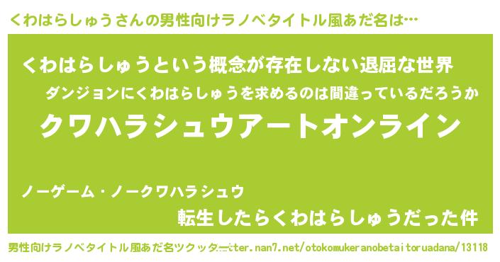 | 女子向けラノベタイトル風あだ名 | 『誰かこのくわはらしゅうを説明してください! ~契約から始まるウェディング~』 |