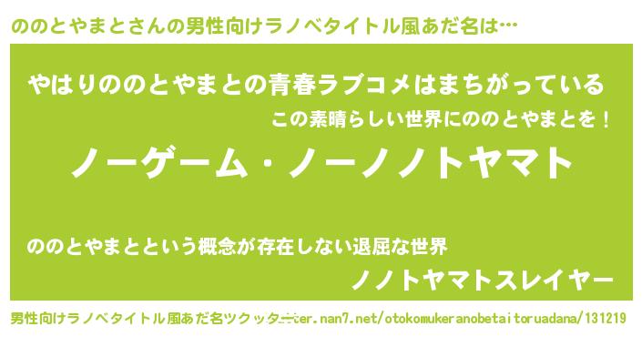 | 女子向けラノベタイトル風あだ名 | 『死神ののとやまとの再婚』 |